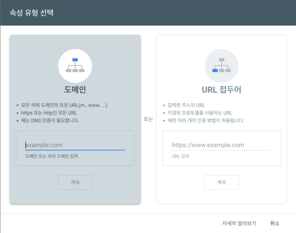 URL 접두어 방식에서는 https://www.example.com과 https://example.com이 별도 속성으로 취급됩니다. 실제 사이트에 접속되는 주소를 정확히 입력하세요.