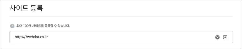 사이트 등록 입력란에 내 웹사이트의 대표 도메인 주소를 입력합니다. 여러 도메인을 사용 중이라면 대표 도메인 하나만 입력하세요.